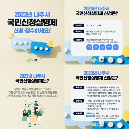 나주시(시장 윤병태)는 2023년 국민신청실명제를 통해 시청 누리집에 공개할 정책을 올 연말까지 접수한다고 10일 밝혔다.