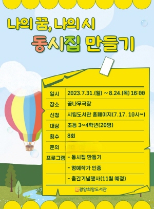 동시집 만들기 수업에 참여하고 싶은 어린이들은 오는 7월 17일 오전 10시부터 광양시립도서관 누리집에서 신청하면 된다.