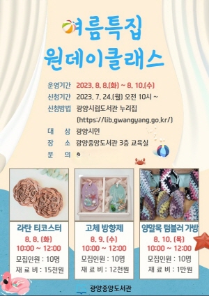 (전남=NSP통신) 김성철 기자 = 광양중앙도서관은 여름을 맞이해 8월 8일~10일까지 3회에 걸쳐 ‘여름 특집 원데이 클래스’ 프로그램을 운영하고, 프로그램에 참여할 수강생을 모집한다고 밝혔다.