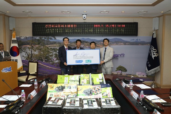 (전남=NSP통신) 김현 기자 = 전남 신안군은 지난 25일 신안군청에서 김 양식어가, 해양관리협의회(MSC KOREA), 유통업체(풀무원식품), 인증어가 가족 등이 참여한 가운데 ASC-MSC 국제인증서 전달식 행사를 가졌다.