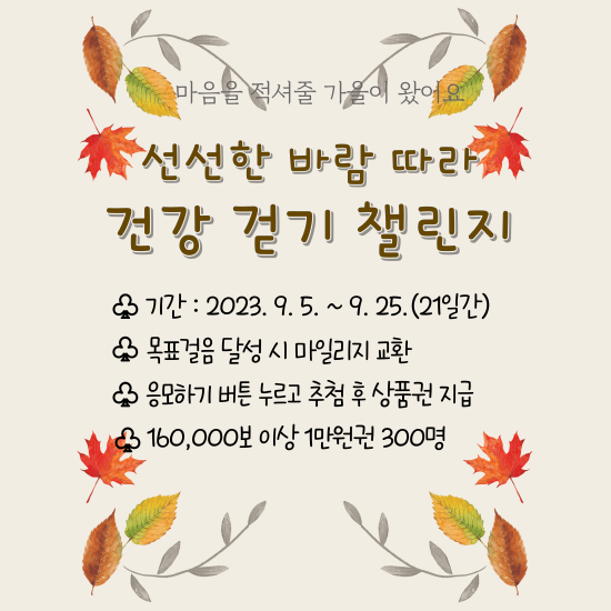이번 걷기 챌린지는 9월 5일~25일까지 진행된다. 1걸음당 1마일리지가 적립되고 1일 최대 8000마일리지가 누적되며, 목표 마일리지 달성 시 쿠폰 교환이 가능하다.