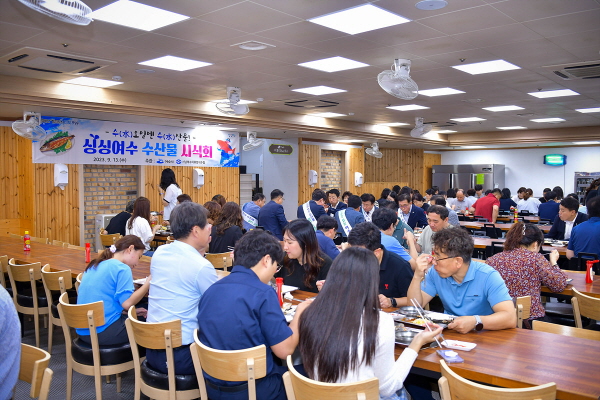 14일 여수시에 따르면 지난 13일 서남해수어류양식수협과 함께 시청 구내식당에서 지역 수산물로 구성된 점심메뉴를 제공하는 ‘싱싱여수 수산물 시식회’가 열렸다.