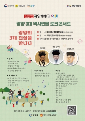 토크콘서트는 광양의 문화유산 전문가가 패널로 참여해 3대 역사 인물의 생애와 문화유산, 현대에 미친 영향, 문화유산 활용과 문화관광 상품화 방안 등을 주제로 이야기할 예정이다.