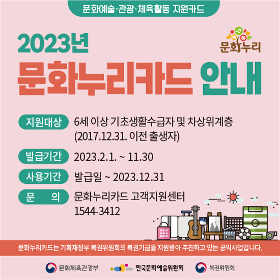 통합문화이용권(문화누리카드)은 문화격차 완화를 위해 기초생활수급자, 차상위계층을 대상으로 지급되는 바우처카드로 문화‧예술, 여행, 체육활동 등의 가맹점에서 이용할 수 있도록 연 11만 원의 금액을 지원한다.