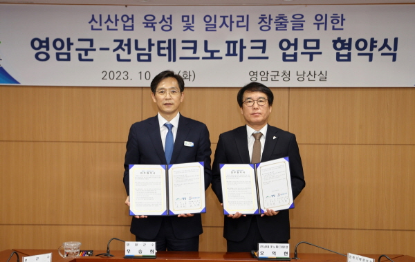 (전남=NSP통신) 강현희 기자 = 영암군(군수 우승희)이 지난 10일 군청에서 전남테크노파크(원장 오익현)와 ‘신산업 육성 및 영암군 일자리 창출 업무협약’을 체결했다.