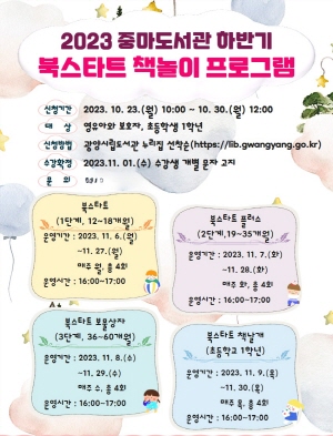 (전남=NSP통신) 김성철 기자 = 광양중마도서관은 독서회원을 대상으로 하반기 북스타트 책놀이 프로그램 수강생을 모집한다고 밝혔다.