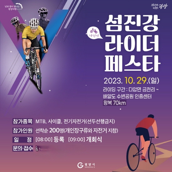 (전남=NSP통신) 김성철 기자 = 광양시가 10월 29일 섬진강자전거길 일원에서 개최될 ‘섬진강 라이더 페스타’ 참가자를 선착순 모집한다고 밝혔다.