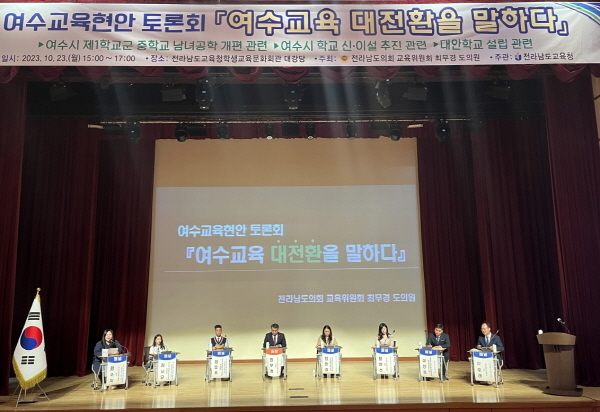 (전남=NSP통신) 서순곤 기자 = 전라남도의회 최무경 의원(여수4)은 23일 전라남도교육청학생교육문화회관 대강당에서 ‘여수교육 대전환을 말하다’를 주제로 토론회를 개최했다.