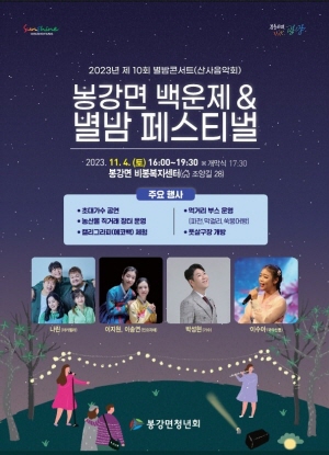 이미영 봉강면장은 “제10회를 맞이하는 별밤콘서트는 지역 주민들의 문화예술 향유의 기회와 화합의 장인 만큼 가족, 지인들과 함께 놀러 오셔서 깊어가는 가을의 정취를 만끽하시길 바란다”고 말했다.