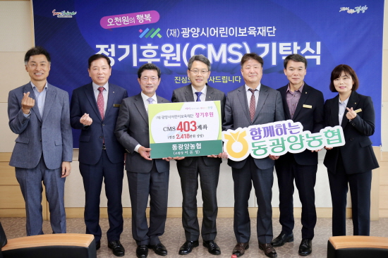 (전남=NSP통신) 김성철 기자 = 동광양농협(조합장 이돈성)은 지난 3일 광양시청 접견실에서 광양시어린이보육재단(이사장 이광용)에 정기후원(CMS) 기탁식을 가졌다.