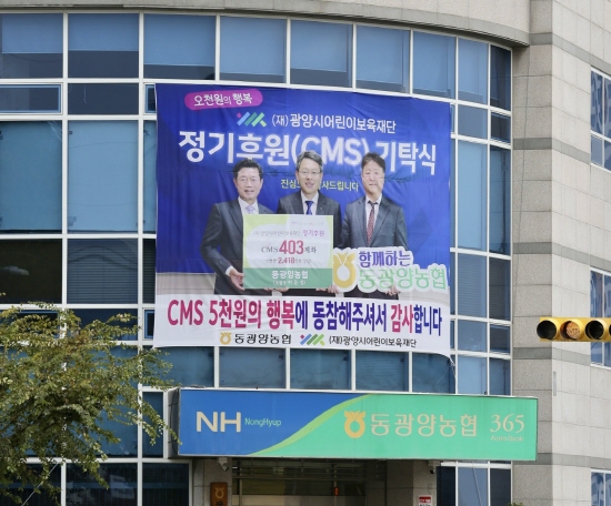 한편 동광양농협은 광양시민의 자발적인 어린이보육재단 후원을 이끌어 내기 위해 본점 건물 외벽에 대형현수막을 부착해 올 연말까지 홍보를 할 계획이다.