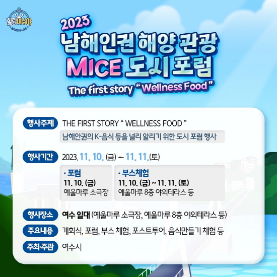 (전남=NSP통신) 서순곤 기자 = 여수시가 오는 10일부터 2일간 예울마루에서 ‘남해안권의 웰니스 푸드’ 주제로 ‘2023 남해안권 해양 관광·MICE 도시 포럼’을 개최한다.
