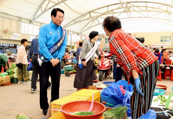강진원 군수가 전통시장을 방문해 상인들과 대화를 나누고 있다. (사진 = 강진군)