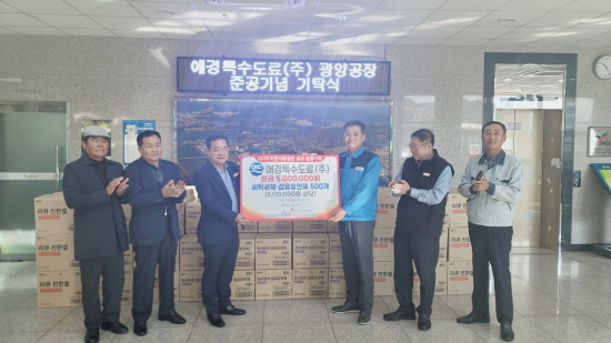 애경특수도료는 광양공장 준공일인 10월 11일을 기념해 총 1011만 원 상당의 기부물품을 광양시사랑나눔복지재단을 통해 태인동에 전달했다.