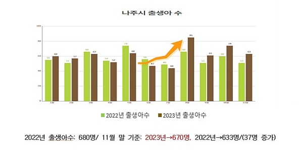 나주시(시장 윤병태)는 지난 11월 기준 출생아 수가 670명으로 전년 동월(633명)과 비교해 5.85%(37명)가 증가했다고 18일 밝혔다.