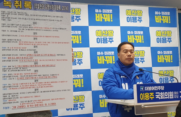 이용주 후보는 19일 오후 여수시청 브리핑룸에서 기자회견을 통해 2014년 여수시장 선거 당시 있었던 정치공작을 통한 구속 사건과 관련된 녹취록 내용이 실제로 본인 육성이라 자인한 주철현 후보에게 즉각적인 사퇴를 요구했다.
