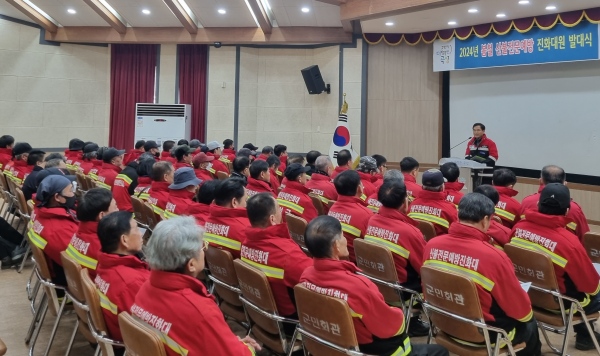 이날 발대식은 군 산불기계화진화대원과 읍면 산불 예방진화대원, 산불담당 공무원 등 90여 명이 참석했으며, 이귀동 부군수의 격려사와 산불전문예방진화대장의 결의문 낭독, 산불방지 교육 등으로 진행됐다.