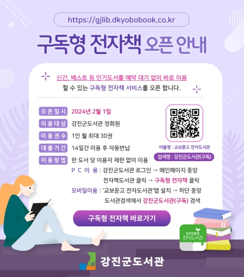 이번에 실시하는 구독형 전자책 서비스는 기존 강진군도서관의 소장형 전자책 서비스와 달리 신간 및 베스트셀러 등 인기도서를 예약 대기 없이 바로 이용할 수 있으며, 1인 최대 월 30권까지 대출이 가능하다.