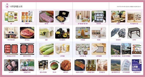 현재 나주시 답례품은 대표 특산물인 나주배를 비롯해 쌀·잡곡, 한우·돼지고기, 숙성홍어와 같은 농축산물과 나주곰탕, 배즙, 각종 장류, 나주배쌀빵 등 가공식품 등 총 34개 품목으로 구성돼 있다.