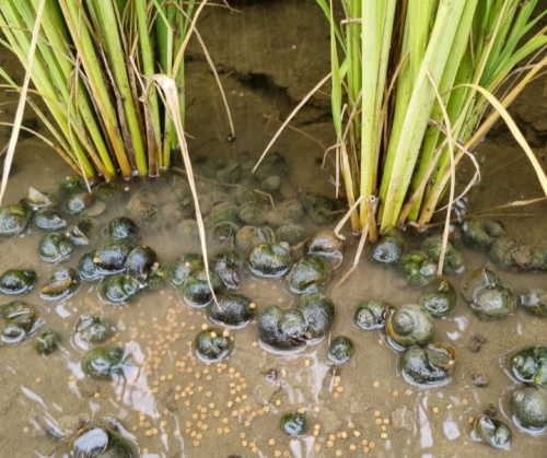 논에 우렁이가 남아 있으면 어린모를 갉아먹는 등 피해를 입을 수 있다.