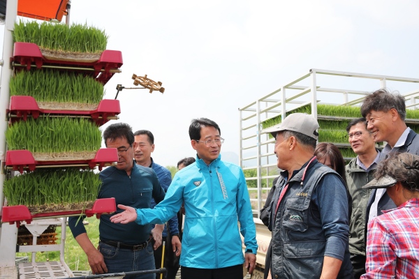 강진원 군수는 농업 현장의 목소리를 듣고 정책에 반영하기 위해 지난달 30일 조생종 벼 모내기 현장인 도암면 항촌리 옥전마을 농가를 방문, 해당 농가를 위로·격려했다.