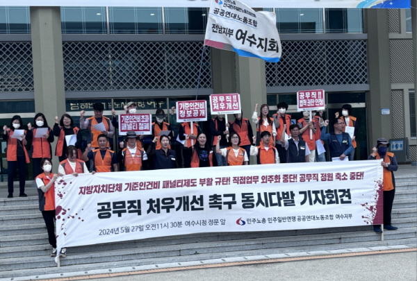이어 “그동안 여수시에 정수대로 인원을 충원할 것과 현장 업무에서 안전이 보장되는 환경개선과 공무직의 차별 처우를 개선해 달라는 요청을 수차례 전달하고 시장과의 차별처우에 대한 고충 처리 면담도 진행하였지만, 아직까지 답변은 없다”고 지적했다.