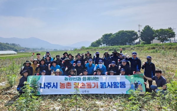 나주시(시장 윤병태)는 지난 5월 배농가에 이어 이 달에도 민·관·군이 함께하는 ‘농촌사랑 일손 돕기’를 실시했다고 19일 밝혔다.