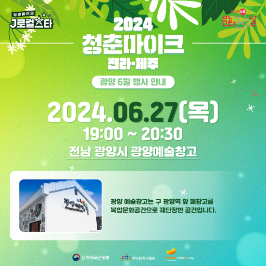 ‘청춘마이크’ 전라·제주권 공연은 무료로 관람할 수 있으며, 자세한 공연 일정은 문화가 있는 날 누리집 또는 ‘J로컬스타’ 공식 블로그를 통해 확인할 수 있다.