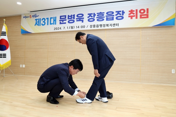 취임식에 참석한 김성 군수는 운동화를 선물로 전달하고, 직접 신발끈을 묶어주며 발로 뛰는 현장행정을 주문했다.