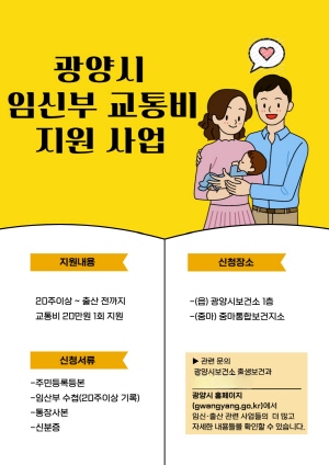(전남=NSP통신) 김성철 기자 = 광양시는 임신부의 이동 편의를 높이고 출산 가정의 경제적 부담을 덜어주기 위해 임신부를 대상으로 20만 원의 교통비를 지원한다고 밝혔다.
