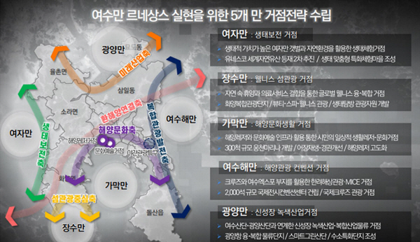 해양환경을 최대한 보존한다는 전제 아래 지속가능한 개발을 추구하겠다는 방침이어서 현재의 세대에겐 소득을, 미래의 후손에겐 잘 보전된 환경을 안겨줄 것으로 기대된다. ‘여수만 르네상스 프로젝트’를 통해 달라질 여수만의 모습이 벌써부터 궁금하다.