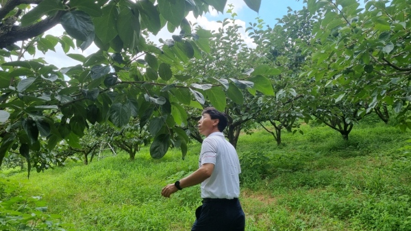 NSP통신-강진군 농업기술센터 관계자가 감 농장에서 탄저병 발생 예찰 활동을 벌이고 있다. (사진 = 강진군)