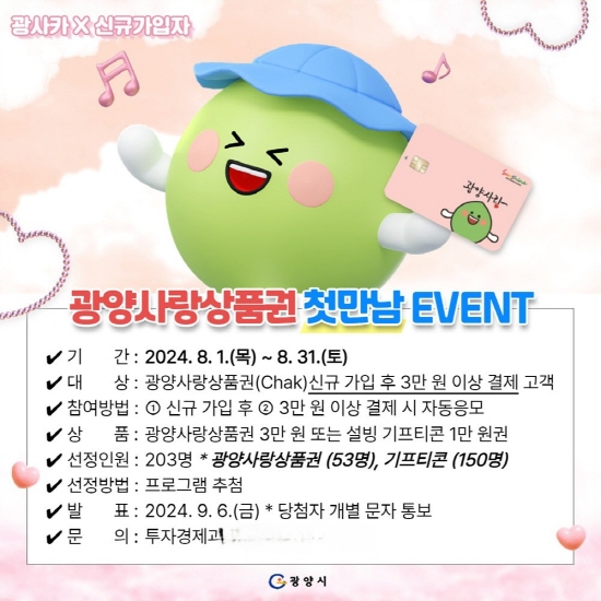 첫 가입 후 8월 한 달 동안 누적 3만 원 이상 결제하면 이벤트에 자동으로 응모된다. 이중 추첨으로 총 203명을 선정하며 선정 여부는 오는 9월 6일 개별 문자를 통해 확인해 볼 수 있다. 당첨자에게는 광양사랑상품권 3만 원 또는 1만 원권 상당의 기프티콘을 지급할 예정이다.