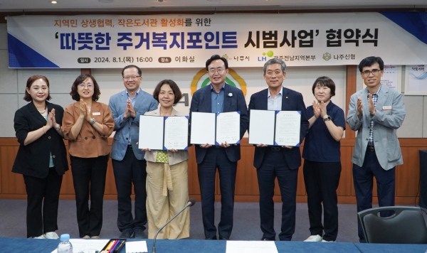 (전남=NSP통신) 김용재 기자 = 나주시(시장 윤병태)가 최근 LH광주·전남지역본부, 나주신협과 작은도서관 및 공동체 활성화를 위한 ‘따뜻한 주거복지포인트 시범사업’ 추진 업무협약을 체결했다.