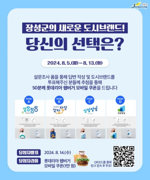 (전남=NSP통신) 김용재 기자 = 장성군이‘성장 장성’으로 ‘도시 브랜드 네이밍’을 확정한데 이어 지난 5일부터 디자인 선호도 조사에 들어갔다.