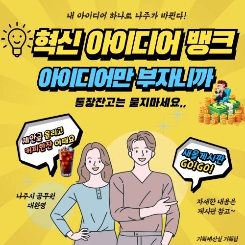 혁신 아이디어 뱅크는 민선 8기 살기 좋은 행복 나주, 앞서가는 으뜸 나주를 목표로 복잡·다변화하는 행정서비스 수요에 대응하기 위한 정책의 다양성 확보와 공직사회 내 소통 강화를 위해 마련됐다.