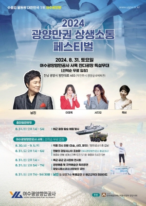 (전남=NSP통신) 김성철 기자 = 여수광양항만공사(사장 박성현, 이하 YGPA)는 광양만권 지역민과 항만종사자 가족들을 위한 ‘광양만권 상생소통 페스티벌’을 8월 31일 여수광양항만공사 사옥 잔디광장 및 중마일반부두(해군함정 공개 행사)에서 개최한다고 밝혔다.