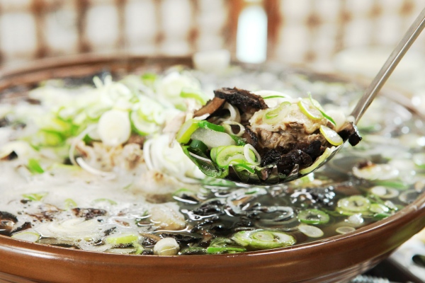 능이닭곰탕(곡성3미)은 생닭을 초벌로 끓인 뒤 국물을 비우고 다시 육수를 우려 닭 고유의 비린내를 잡았다. 능이버섯 특유의 향과 맛이 어우러진 국물이 담백하면서도 시원하다.