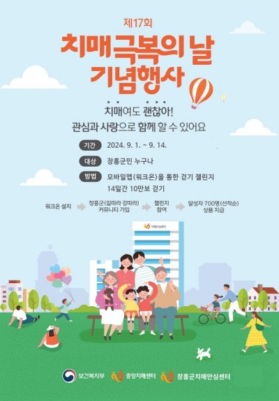(전남=NSP통신) 김용재 기자 = 장흥군이 치매극복의 날(9월 21일)을 맞아 ‘2024년 치매극복의 날 기념 걷기행사’를 진행한다.