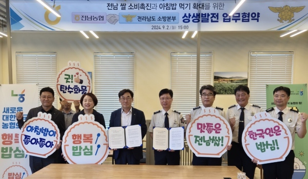 (전남=NSP통신) 김용재 기자 = 농협전남본부(본부장 박종탁)는 지난 2일 전남소방본부(소방본부장 오승훈)에서 임직원 10여 명이 참석한 가운데 ‘전남 쌀 소비촉진 및 아침밥 먹기 확대’를 위한 상생발전 업무협약을 체결했다.