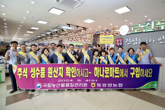 (전남=NSP통신) 김성철 기자 = 동광양농협(조합장 이돈성)이 국립농산물품질관리원 전남지원(지원장 방도혁)과 추석을 앞두고 지난 4일 동광양농협하나로마트와 중마시장에서 원산지 표시 점검 및 홍보 캠페인을 펼쳤다.