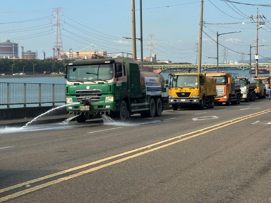 ‘클린광양 클린로드’는 기후 변화로 인한 도심 열섬효과를 완화하고 도로의 재비산먼지를 개선하고자 시행하는 도로변 살수 작업이다.