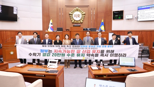 시의회는 건의안을 통해 ▲정부는 지속가능한 쌀 산업 유지를 위해 수확기 쌀값 20만원 수준 유지 약속을 즉시 이행할 것 ▲매년 반복되는 쌀값 문제를 해결할 수 있는 항구적이고 실효적인 쌀값 안정화 대책을 마련할 것 등을 강력히 촉구했다.