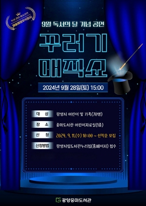 (전남=NSP통신) 김성철 기자 = 광양시는 9월 28일 오후 3시 독서의 달을 맞아 광양중마도서관에서 어린이와 가족 70명을 위해 독서 권장 마술공연 ‘꾸러기 매직쇼’를 마련했다고 밝혔다.