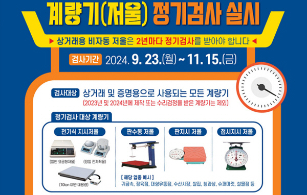 (전남=NSP통신) 서순곤 기자 = 여수시는 공정한 상거래 질서 확립과 소비자 피해 예방을 위해 23일부터 11월 15일까지 상거래용으로 사용되는 계량기(저울)에 대한 정기검사를 시행한다.