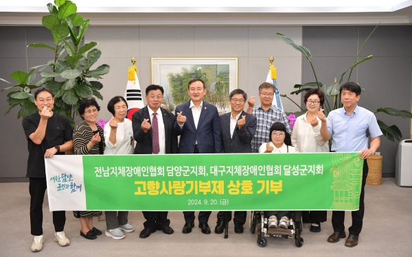 (전남=NSP통신) 김용재 기자 = 담양군과 대구 달성군 한국지체장애인협회(이하 지장협)가 고향사랑기부금을 각 지자체에 상호 기탁하며 고향사랑의 마음을 전달했다.