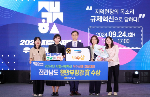 (전남=NSP통신) 남정민 기자 = 전라남도는 대구 EXCO에서 열린 행정안전부의 ‘2024년 지방규제혁신 우수사례 경진대회’에서 우수상(행안부장관상)을 수상했다고 25일 밝혔다.