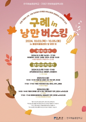 K-ART를 선도하고 있는 ‘한국예술종합학교’ 아티스트들이 국립공원 제1호 지리산국립공원과 청정하천 섬진강 등 자연이 만들어 낸 최고의 무대에서 10월 3일~5일까지 ‘구례 in 낭만 버스킹’이라는 주제로 공연을 펼친다.