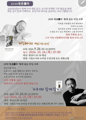 (전남=NSP통신) 김성철 기자 = 광양시는 10월~11월까지 광양중앙도서관에서 2030 청년들이 함께 모여 책을 깊이 있게 이해하고 독후 활동을 경험하는 ‘문화예술체험형’ 프로그램 ‘2030청춘讀려: 함께 읽는 리딩크루’를 운영한다고 알렸다.