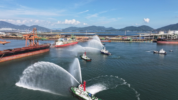 여수해경에 따르면 25일 오후 3시부터 광양항 포스코 원료부두에서 여수화학재난합동방재센터, 광양시, 광양소방서, 해양환경공단 여수지사, 포스코 등 총 13개 기관, 선박 13척, 사고 대응 차량 10척을 포함한 150여 명이 참가해 위험·유해물질 사고 합동 훈련을 진행했다.